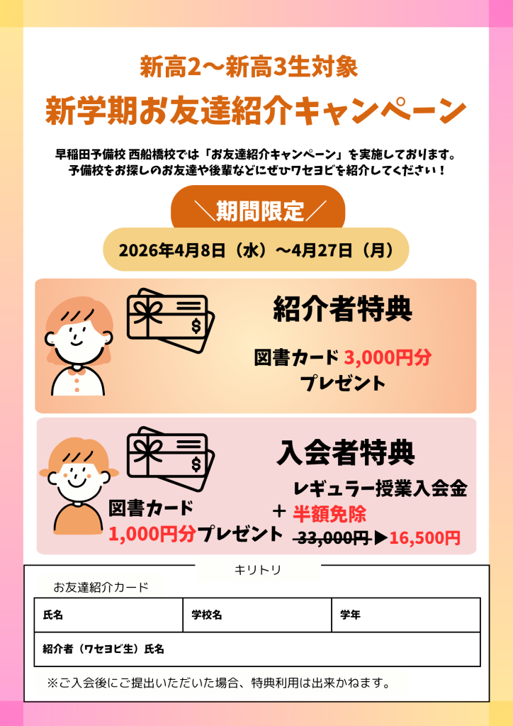 本日から早稲田予備校西船橋校では1学期レギュラー授業が開講となります。