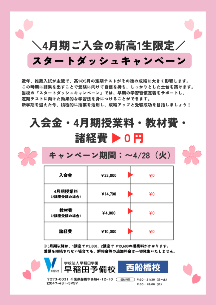 「高1生の最初の一歩を、金銭的な不安なく、全力で応援したい」。そんな想いから、早稲田予備校西船橋校では高1生を対象に「スタートダッシュキャンペーン」を実施しています!